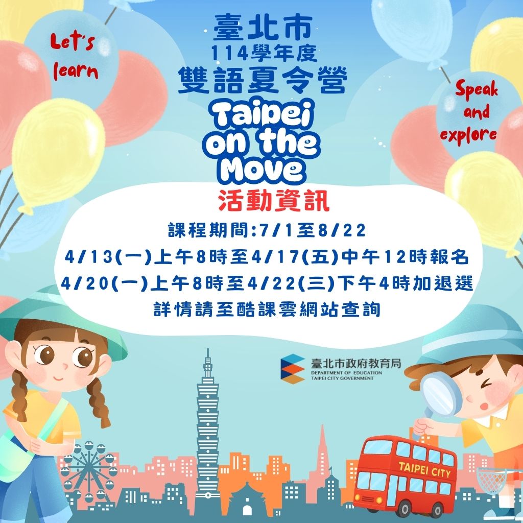 各校依特色規劃多元課程,學生可跨校選課參與;教育局並整合市政資源,推出亮點活動「Taipei on the Move 城市行動雙語夏令營」,由西湖國小、舊莊國小、信義國中及雙園國中之參與學生,於課程中規劃參與本活動之學習體驗,透過議會參訪與城市走讀,並搭乘雙層觀光巴士探索臺北市重要地標,結合英語導覽與任務學習,進行英語表達與分享,深化學生對城市的理解與公民意識。